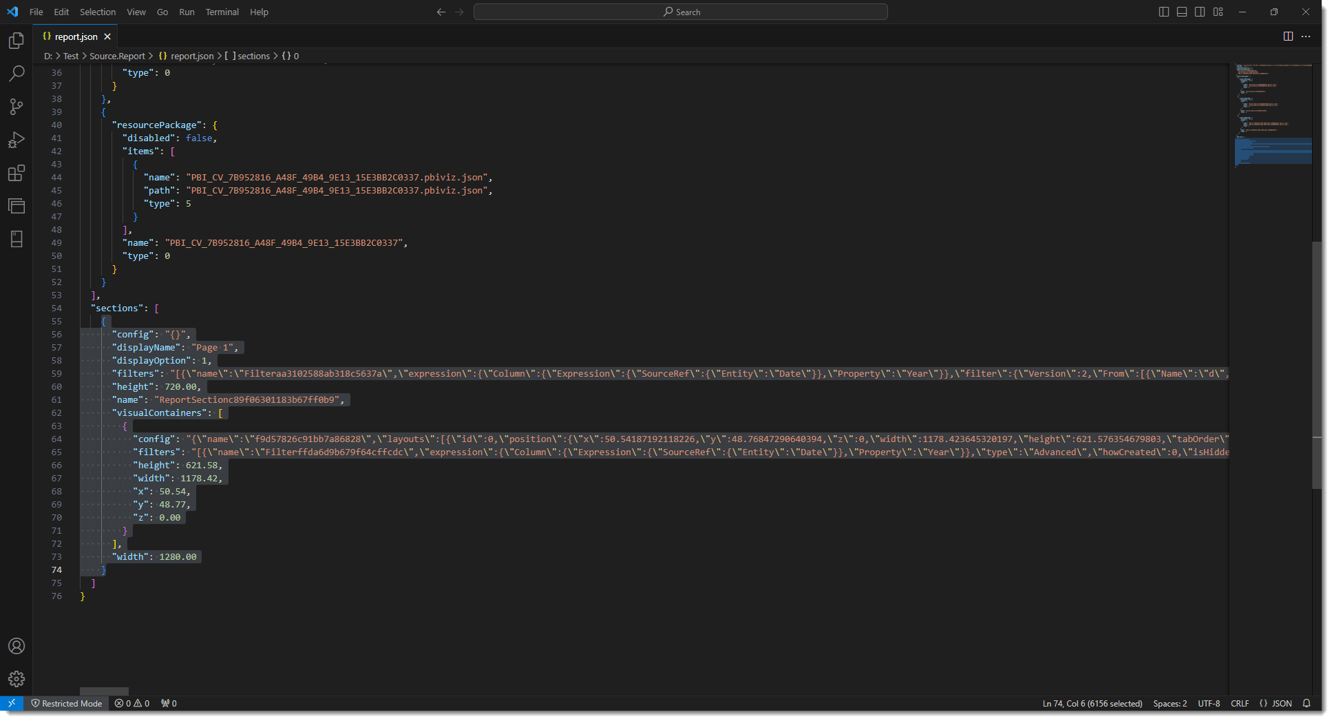 After enabling the preview feature and saving both of the Power BI Desktop files as Power BI projects, you’ll see a Power BI project file (.pbip) for each, as well as a folder for both the dataset and report of each original Power BI Desktop file. Open up the report.json file for the source report (I’m using VS Code in the image below) and you will see a sections element that contains the details of the page (highlighted text in the image). Copy that to the same section in the report.json file of the target, and you will now have a perfect copy of the source report which includes any custom interactions & page-level filters as well. Bazinga!!