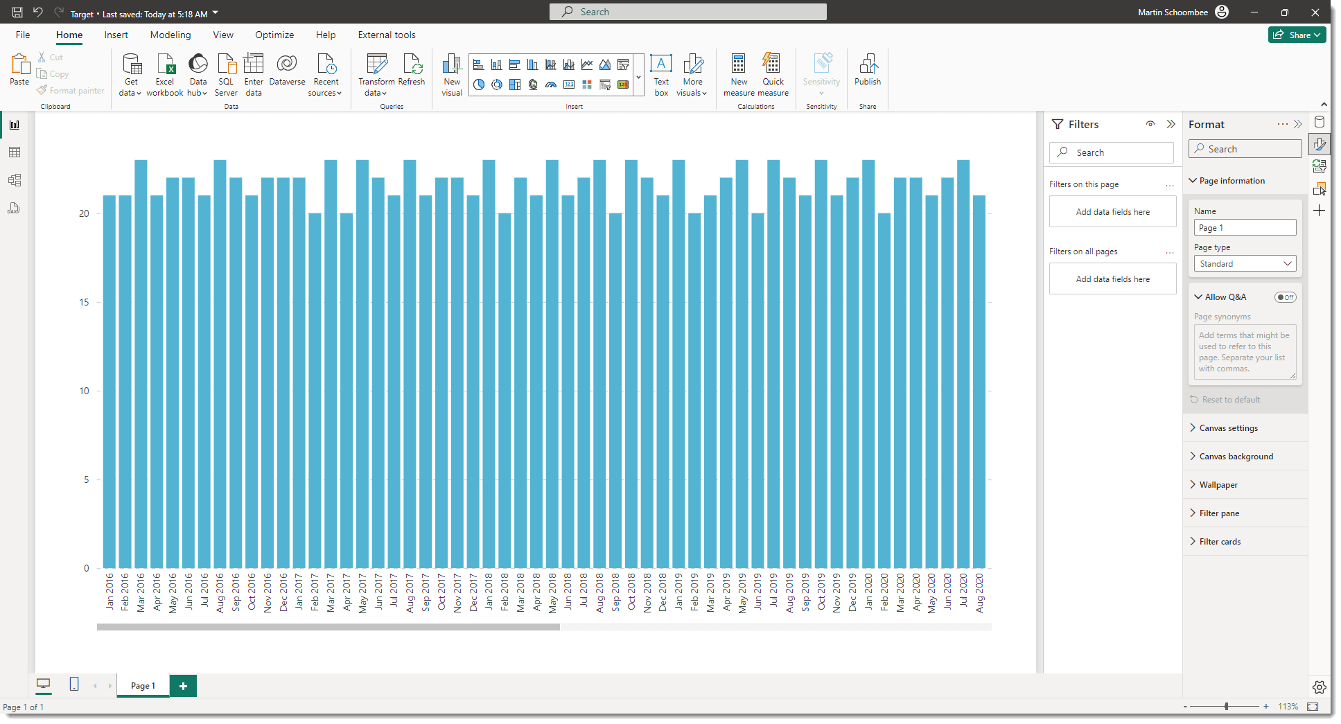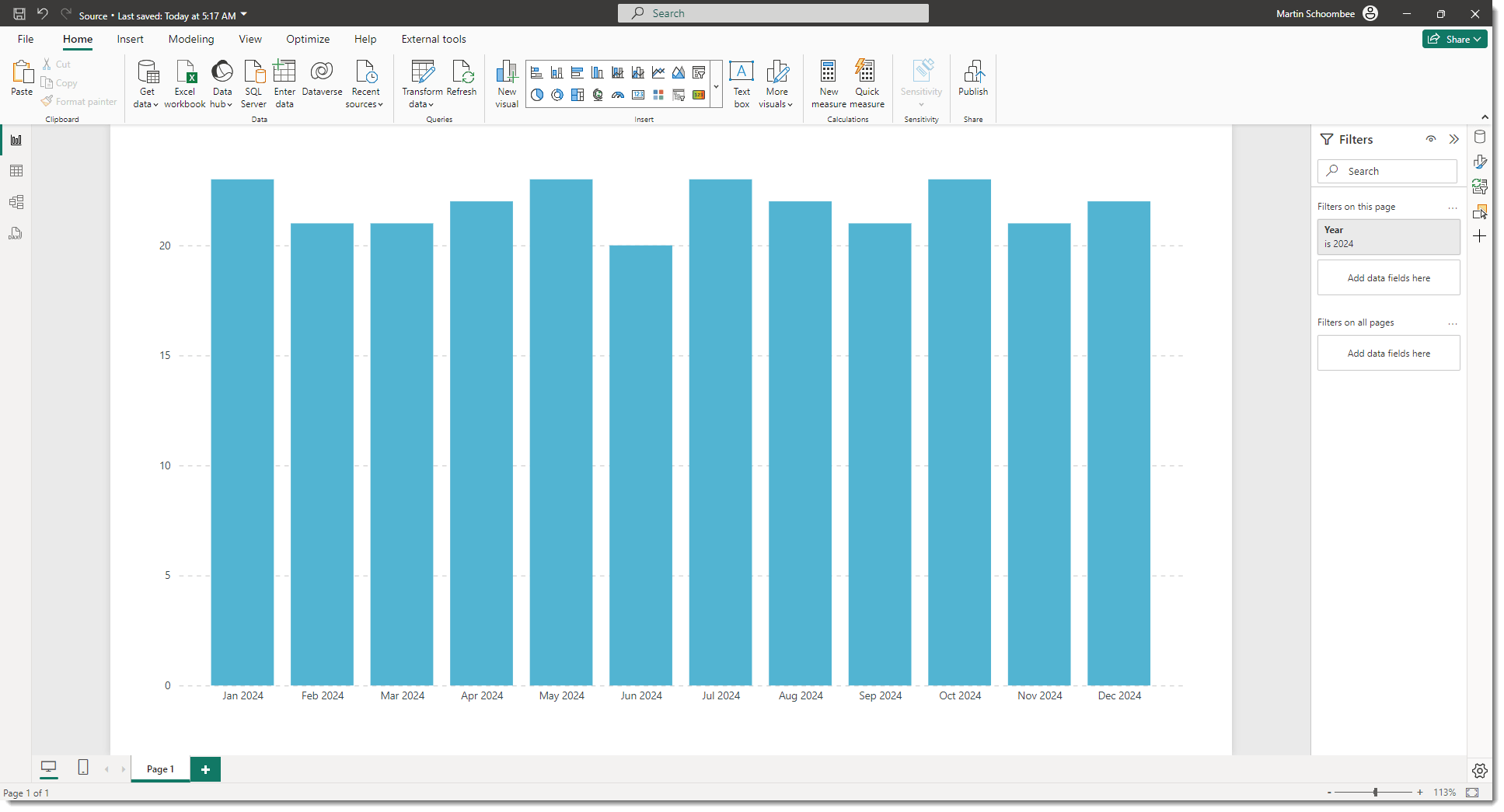 Take the following report page as an example (image below): We have a graph that shows the number of working days per month, and have applied a filter to the entire page to only show data for 2024.